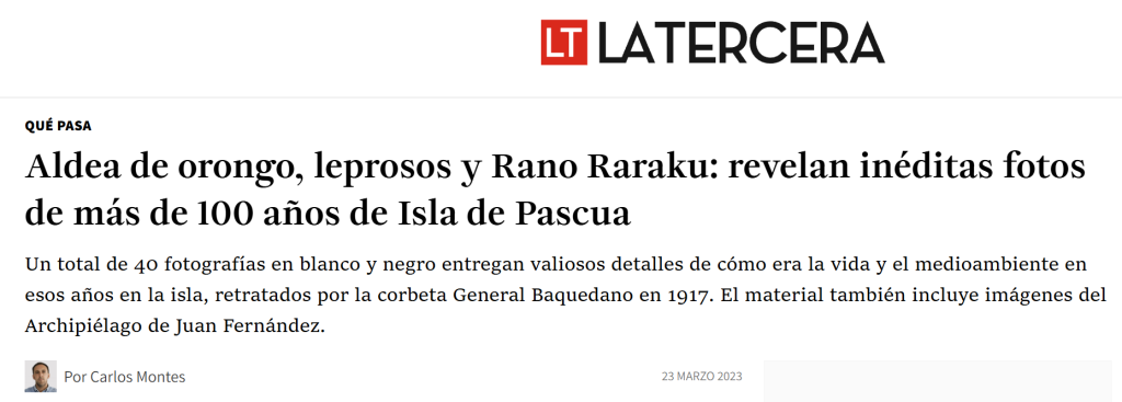 Se trata de un hallazgo inédito. Fotografías que estuvieron guardadas por décadas y que más de 100 años después son reveladas. Se trata de una colección de 40 fotos de Isla de Pascua y Juan Fernández que datan de 1900. Se trata de imágenes en blanco y negro, que fueron dadas a conocer por el sitio web Enterreno, las que entregan valiosos detalles de cómo era la vida y el medioambiente en esos años en ambas islas, incluso con la aparición de la corbeta Buque Escuela Baquedano en 1917.