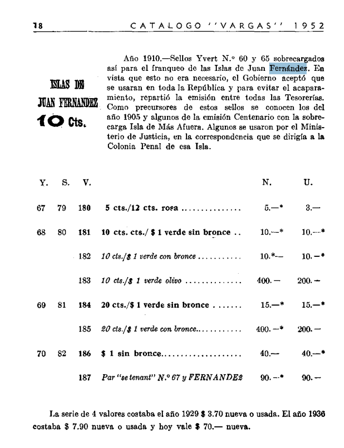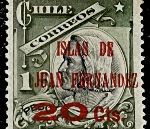 Anteriormente nos hemos referido a estampillas alusivas al archipiélago de Juan Fernández, en esta entrada nos referiremos a las estampillas “sobre cargadas” con el sello “Islas de Juan Fernández 10 Cts”, lo que podría suponerse que estaba destinado a financiar el franqueo de las cartas y postales desde la isla, lo que en realidad no fue así, ya que a diferencia de otros sellos similares, estos se vendieron en todo el pais, como lo refiere el “Catálogo Vargas”, en su página 18, edición 1952.