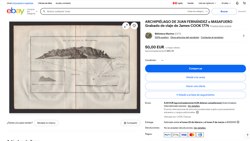 Presentamos esta oferta en EBAY, consistente en una impresión del mapa de “MASAFUERO”, levantado en 1774, durante el viaje de James Cook al Océano Pacífico.